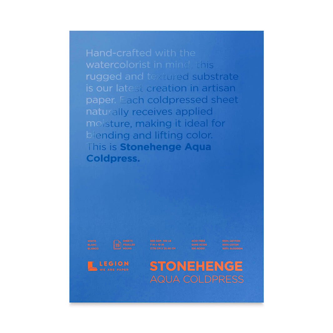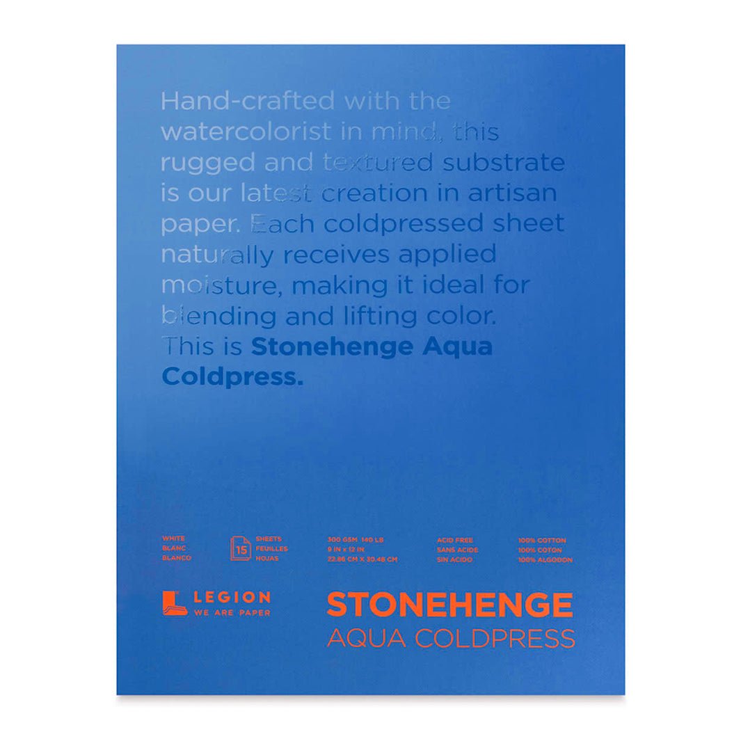 El papel Stonehenge Aqua Cold Press es puro algodón, sin ácidos, de textura fina. Cada block trae 15 hojas de 300 g.