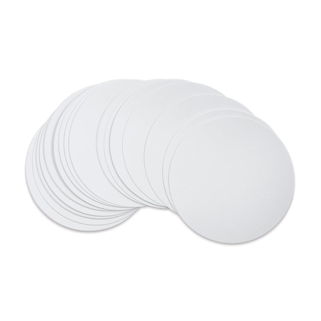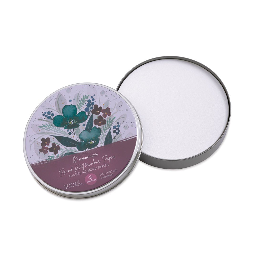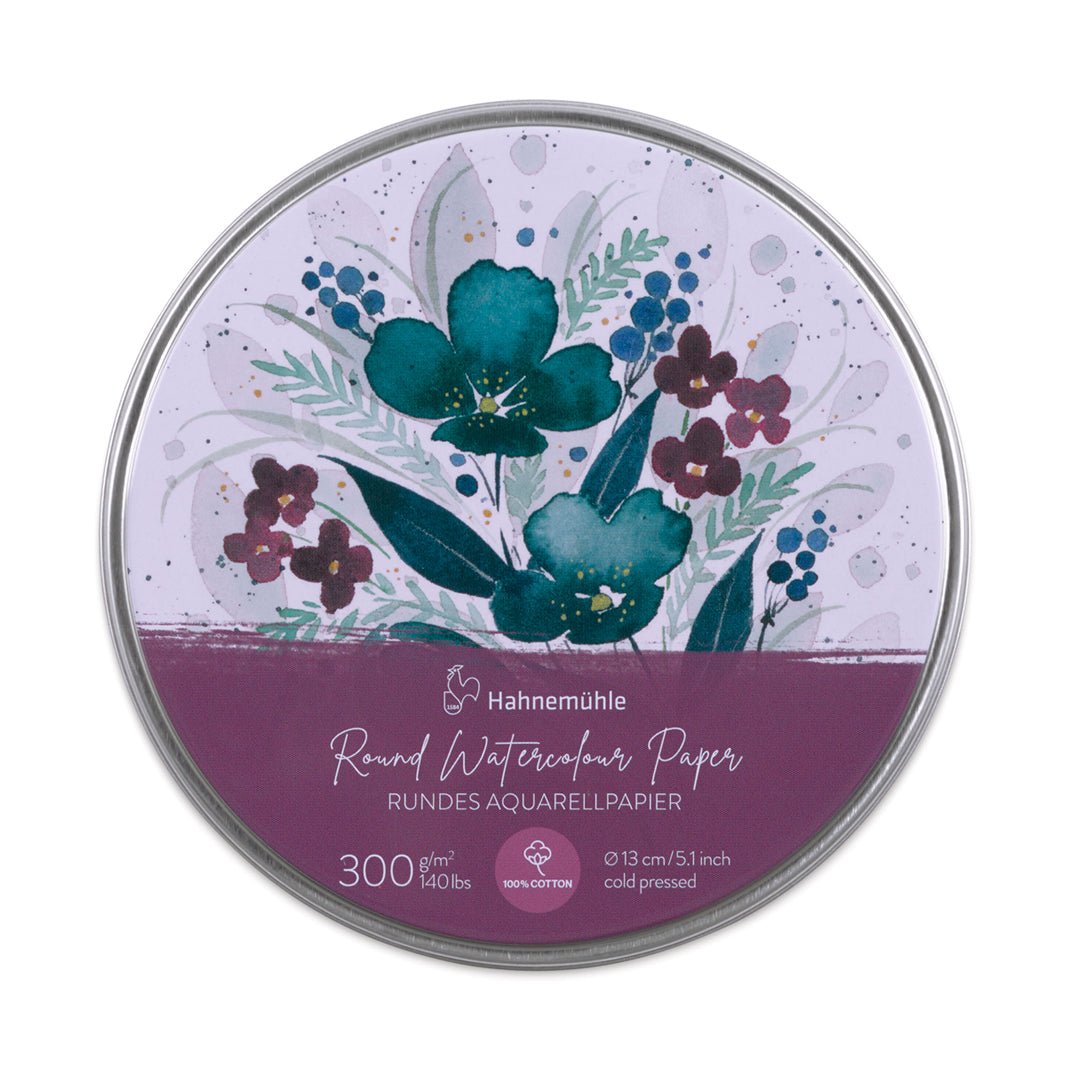 El formato redondo Hahnemühle mide solo 13cm de diámetro. Está hecho de papel Expression de 300g, 100% algodón, en grano fino. Es un papel de batalla: podrás usar líquido para enmascarar y cinta sin que la superficie se maltrate; podrás pintar varias capas una sobre otra e incluso pintar de ambos lados.