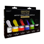 Este es el set de Colores Básicos e incluye 6 tubos de acrílico de 100 ml en los siguientes tonos: 100 Blanco de Titanio, 103 Amarillo Medio Azo, 122 Tono Rojo Cadmio, 140 Azul Ultramar, 153 Verde Permanente y 170 Negro de Marfil.