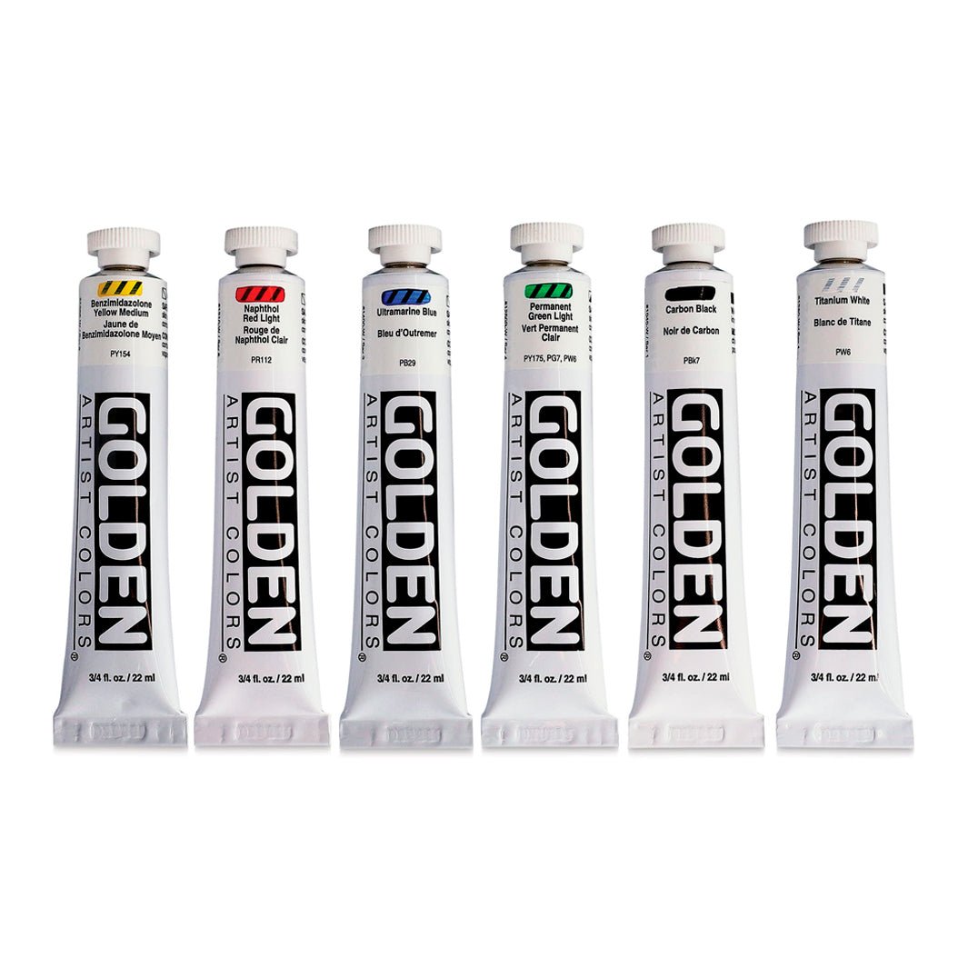 Este set introductorio de Golden trae 6 tonos primarios perfectos para iniciarte en el mundo del acrílico profesional: Amarillo Benzimidazolona Medio, Rojo Naftol Claro, Azul de Ultramar, Verde Permanente Claro, Negro de Carbón y Blanco de Titanio. Cada tubo trae 22 ml de pintura.