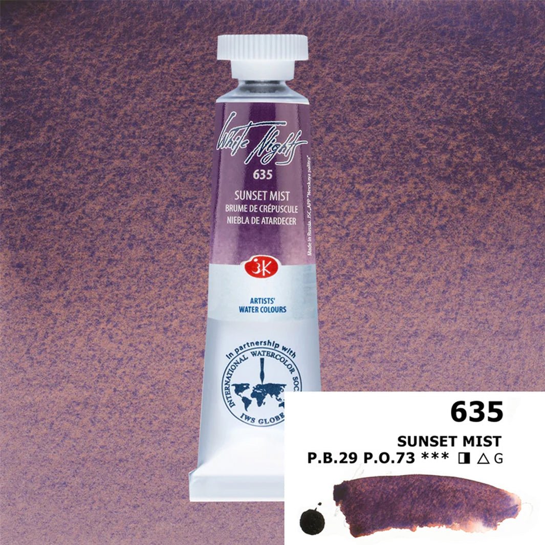 Este mini set de acuarelas White Nights Sunset trae los colores Rose Mist, Purple Mist y Sunset Mist, todos en presentación de tubo de 10 ml.