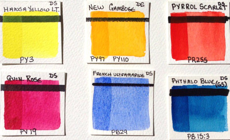 El set de acuarelas Daniel Smith Essentials Watercolor Set incluye 6 tubos de acuarela de 5 ml cada uno, en los colores: amarillo hansa claro, gutagamba, rosa quinacridona, scarlata pirrolo, azul ftalo GS y ultramarino francés.
