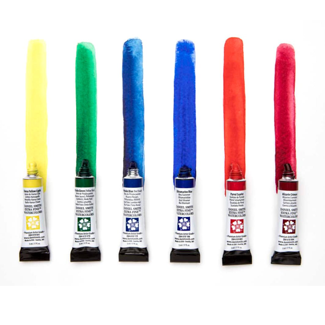 El set de acuarelas Daniel Smith Milind Mulick's Master Set incluye 6 tubos de acuarela de 5 ml cada uno, en los colores: Hansa Yellow Light, Phthalo Green (Yellow Shade), Phthalo Blue (Green Shade), Ultramarine Blue, Pyrrol Scarlet y Alizarin Crimson.