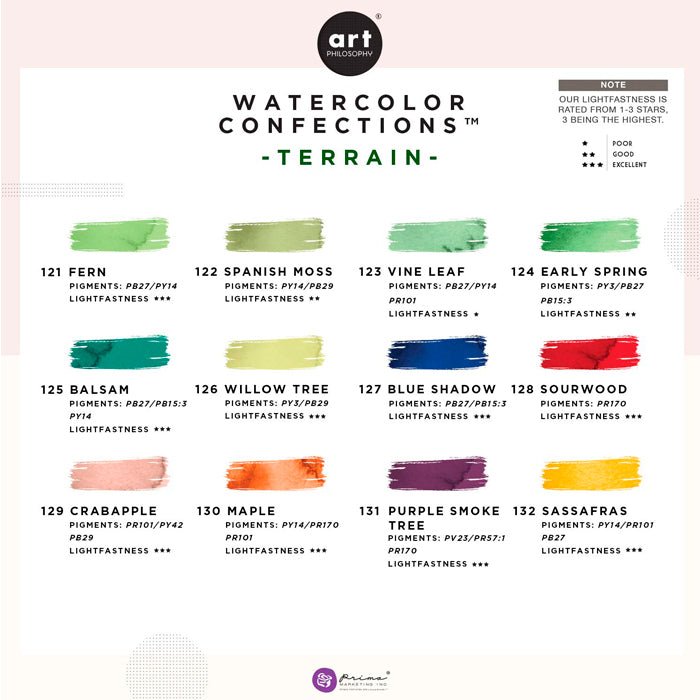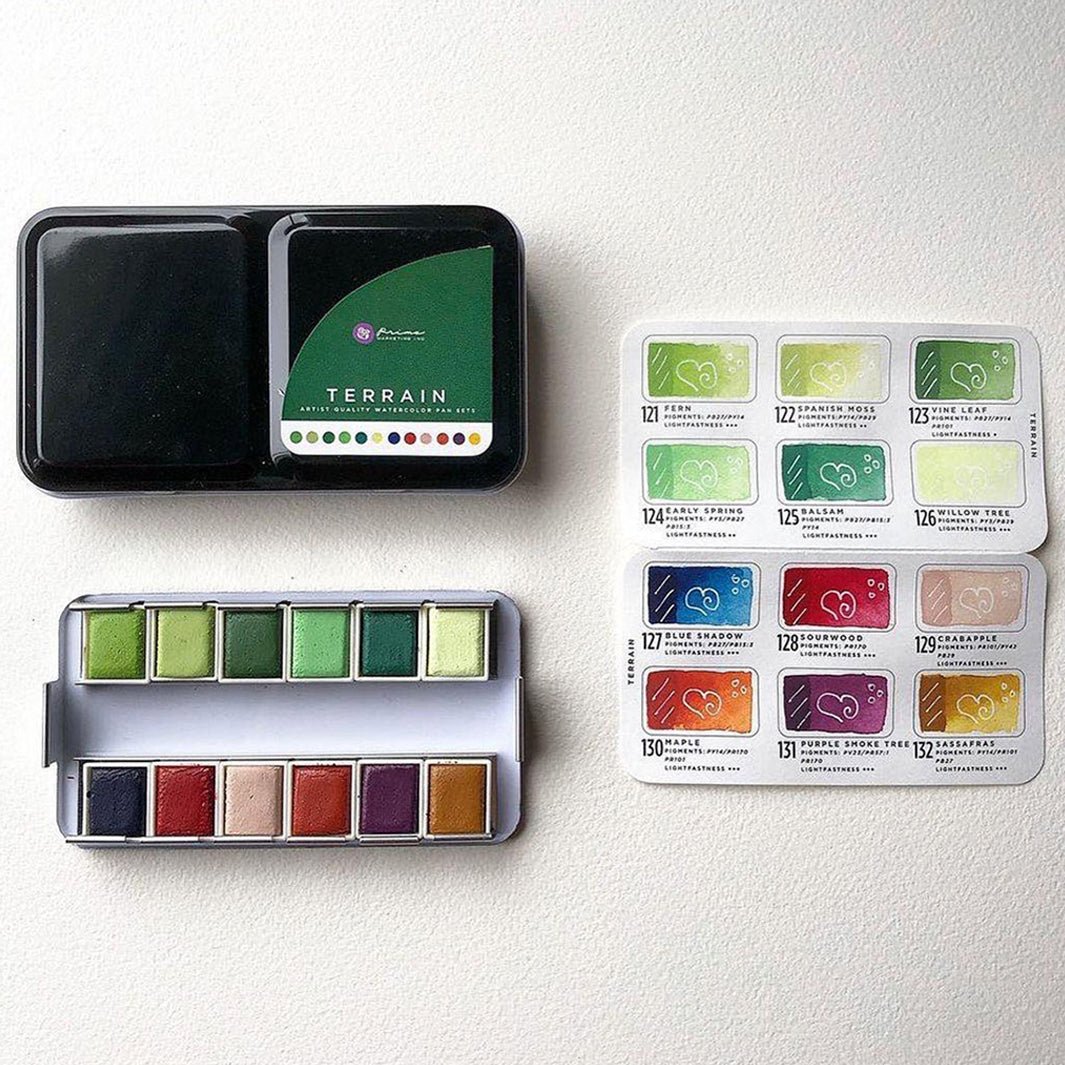 Este es el set Terrain de la colección de acuarelas Terrain de Art Philosophy (Prima Marketing). Los colores de este set fueron elegidos para pintar paisajes con mucha vegetación y flora en general: gran variedad de bellos verdes, acompañados de otros colores cálidos. ¡Es perfecto para completar tu colección de acuarelas!