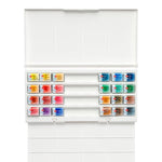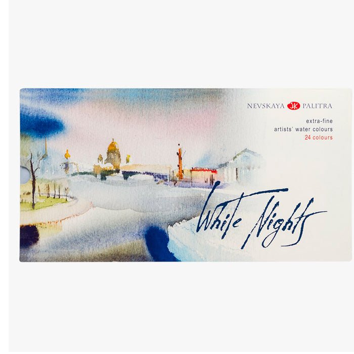 Los estuches White Nights traen pastillas de acuarela completas, en vez de las típicas medias pastillas. Este set de 24 incluye los siguientes colores: amarillo cadmio limón, amarillo cadmio medio, ocre amarillo, amarillo oro, rojo tiziano, rojo cadmio claro, ocre rojo, rojo inglés, carmín, laca granza clara, violeta, ultramarino, azul brillante, azul cobalto, azul índigo, verde amarillento, verde esmeralda, verde, siena natural, sombra natural, sombra tostada, marrón de Marte, sepia y negro neutro.