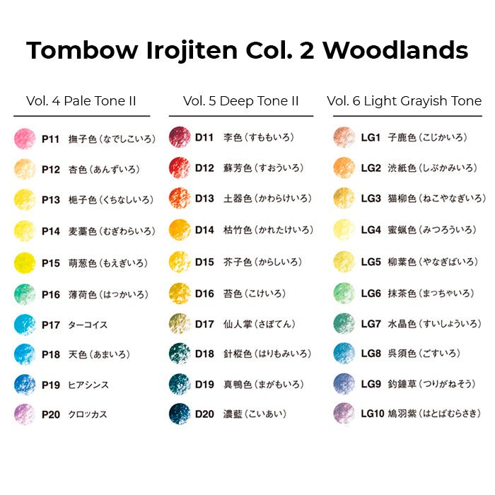 Esta es la colección Tombow Irojiten 2 Woodlands e incluye los volúmenes 4, 5 y 6: tonos pastel, tonos profundos y tonos grisáceos.