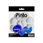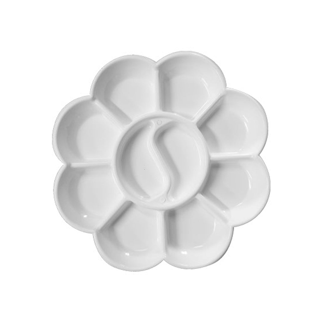 Este godete tiene forma de flor, mide 14.5 x 14.5 x 1.5 cm y trae 10 cavidades. Utilízalo con acuarela, gouache, acrílico y tintas.