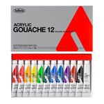 Este set trae 12 tubos de 12ml. Incluye los siguientes colores: carmín, escarlata, amarillo oscuro, amarillo limón, verde claro, verde viridián, azul de ultramar, azul cielo, violeta, siena tostada, negro intenso y blanco de titanio.