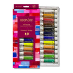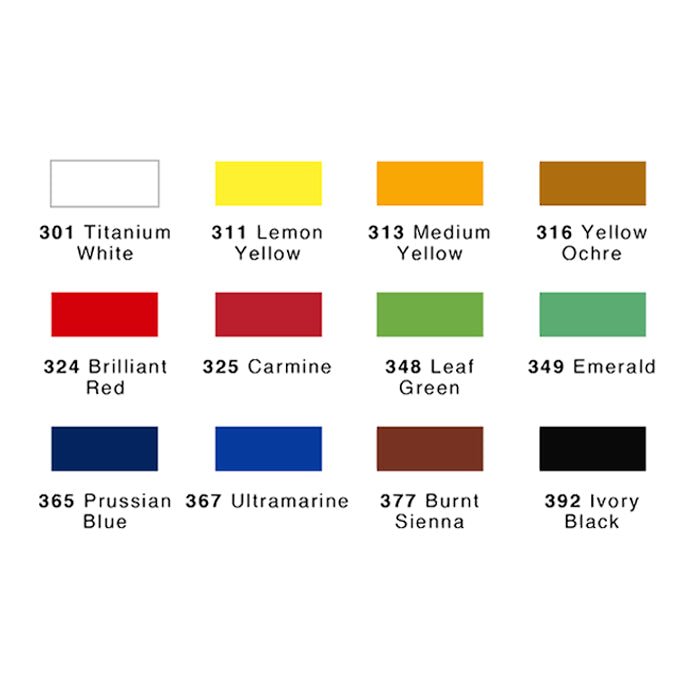 Este estuche incluye 12 tubos de 12 ml cada uno, en los colores: blanco de titanio, amarillo limón, amarillo medio, ocre amarillo, rojo brillante, carmín, verde hoja, esmeralda, azul de Prusia, ultramarino, siena tostada y negro de marfil.