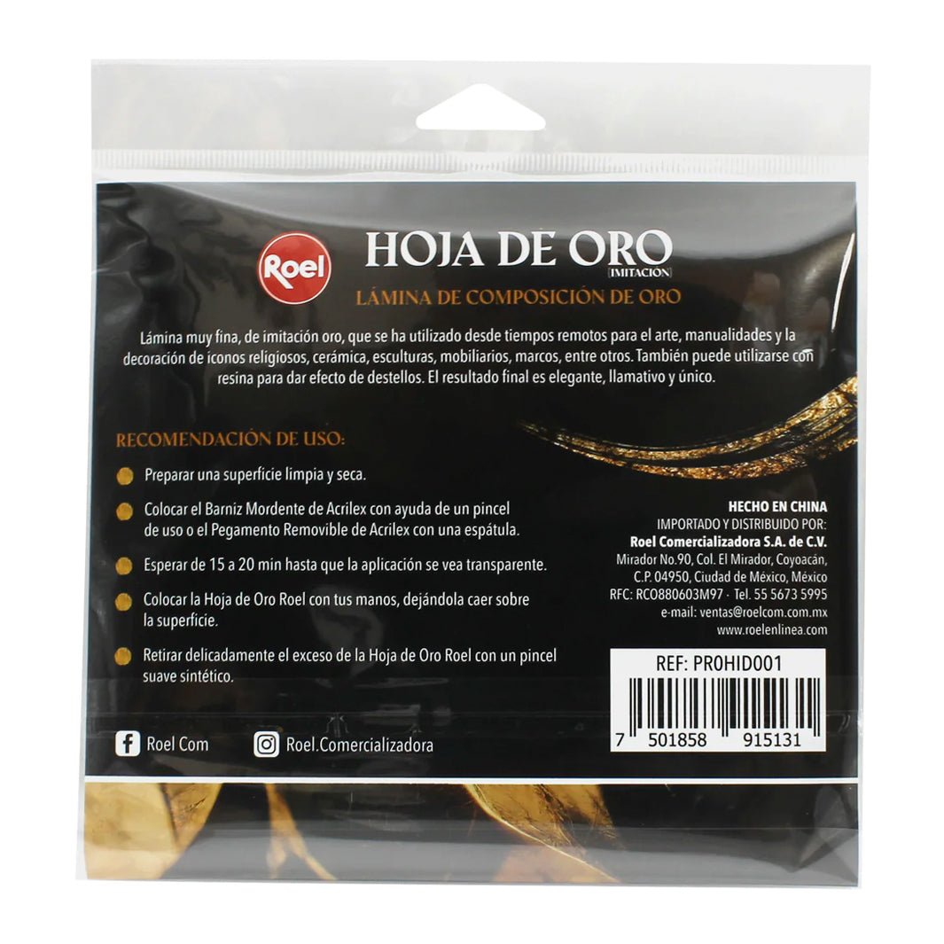El paquete de hoja de oro Roel trae 100 láminas de 14 x 13.5 cm.