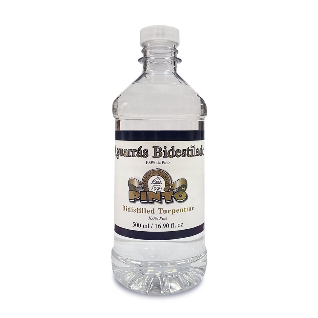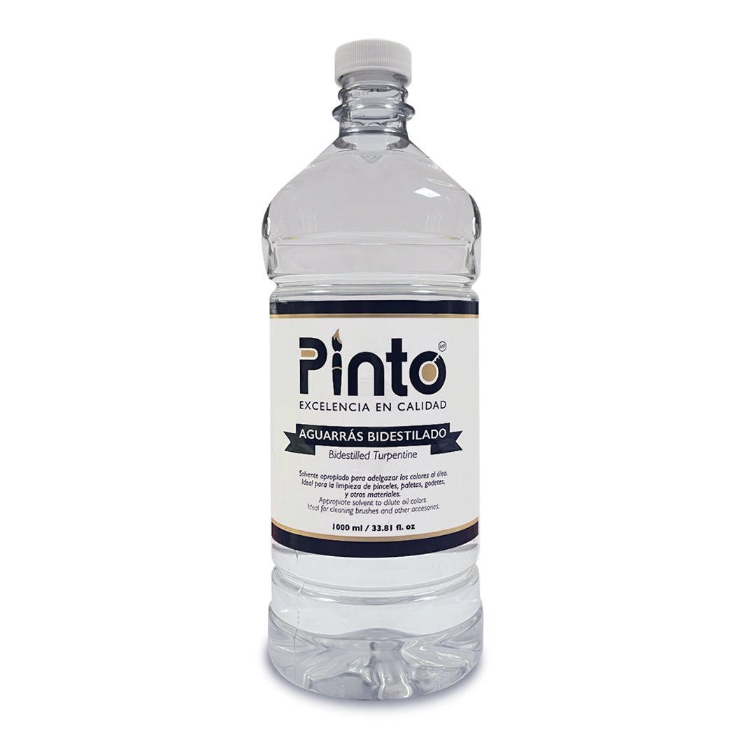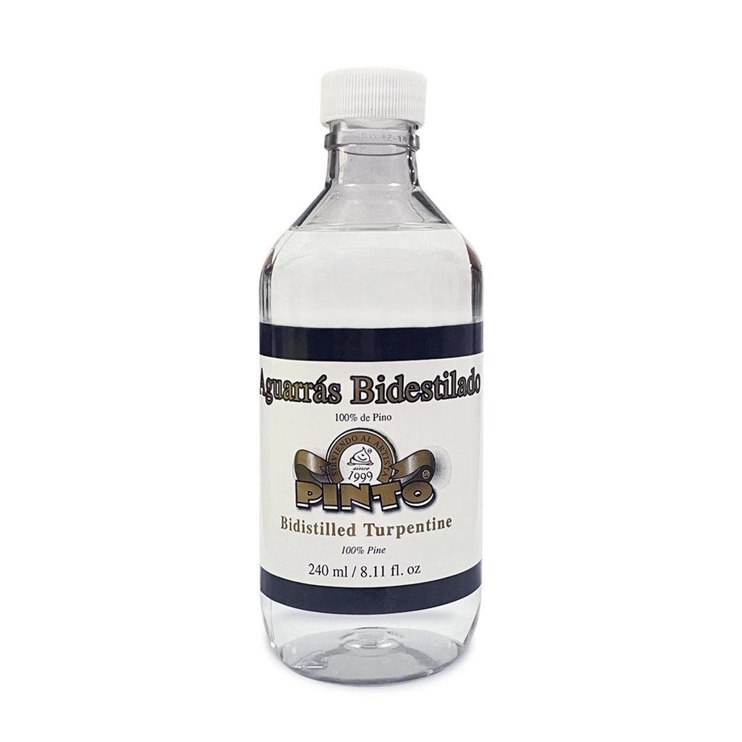 El aguarrás bidestilado (trementina) de Pinto es un aguarrás 100% puro de pino, transparente, graso y cálido al tacto, lo que favorece la brochabilidad del óleo. Es ideal para diluir o adelgazar la pintura, aunque también puede utilizarse para la limpieza de pinceles, paletas, godetes y otros utensilios.