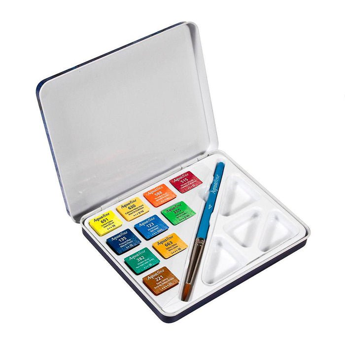 El set de acuarelas Daler Rowney Aquafine con 10 incluye un estuche metálico práctico y portátil, una paleta para mezclas de plástico suave con cuatro cavidades, un pincel redondo Aquafine #4 y 10 pastillas de acuarela en los siguientes tonos: amarillo limón, tono amarillo de cadmnio, tono bermellón, carmesí de alizarina, azul de Prusia, ultramarino, verde hoja, tono viridiano, ocre amarillo y siena tostada.