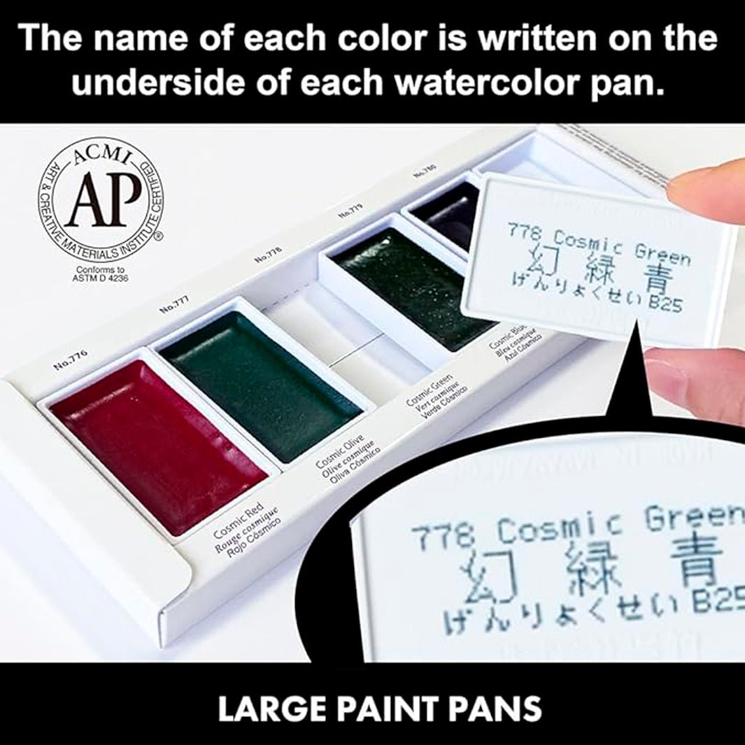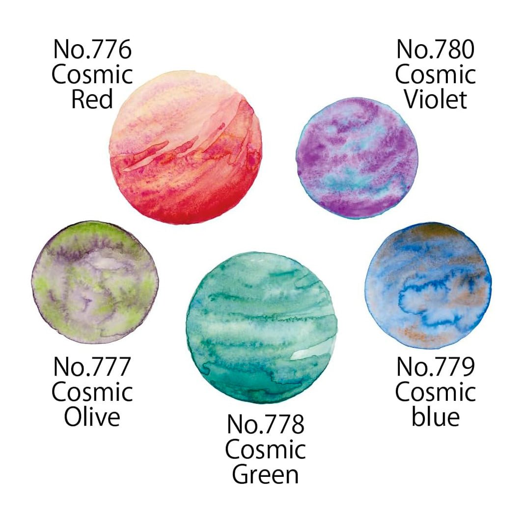 Las acuarelas Gansai Tambi Granulating Colors 2 incluyen 5 colores, diferentes a las del Set 1: Cosmic Red, Cosmic Olive, Cosmic Green, Cosmic Blue y Cosmic Violet. Además, traen una pastilla vacía para que puedas mezclarlas entre sí.