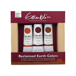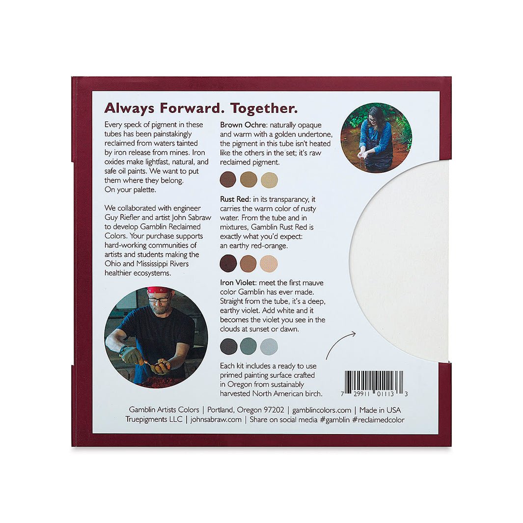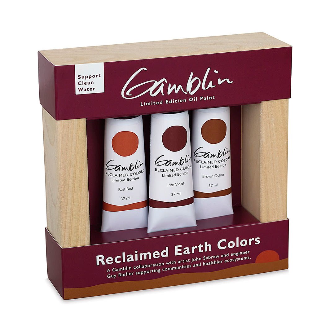 El set Reclaimed Earth Colors utiliza pigmentos minerales extraídos de las aguas de los ríos Ohio y Mississippi, que fueron contaminados durante la Revolución Industrial por la industria minera. Hoy, Gamblin extrae los minerales, los refina al 100% y devuelve aguas limpias a estos ríos. Y claro, manteniendo la calidad y textura excelentes que caracterizan a la línea profesional de óleo Gamblin Artist's Oil Colors.