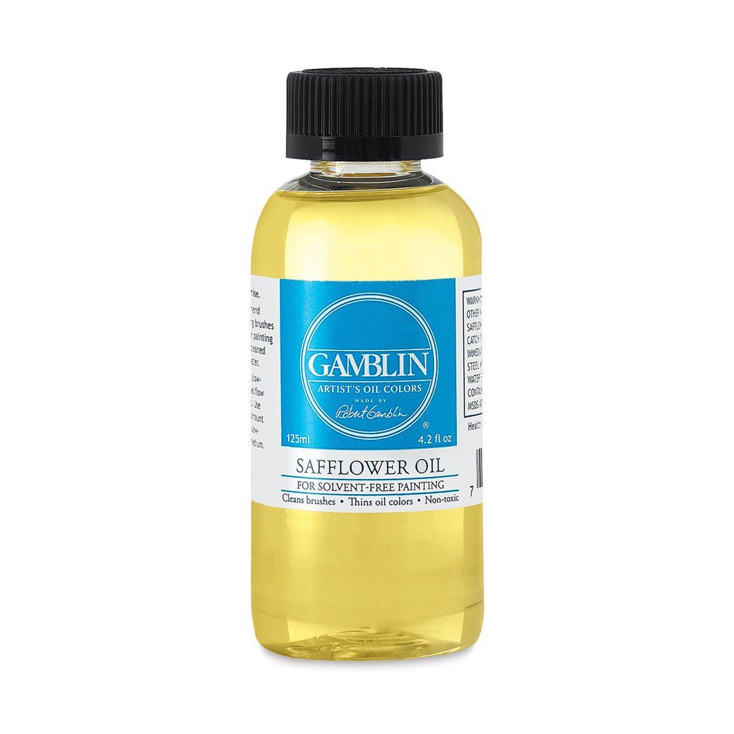 El aceite de cártamo de Gamblin (safflower oil) no puede faltar entre tus herramientas de pintura al óleo: súper versátil y de un tono claro, más transparente y mucho menos amarillento que el aceite de linaza.