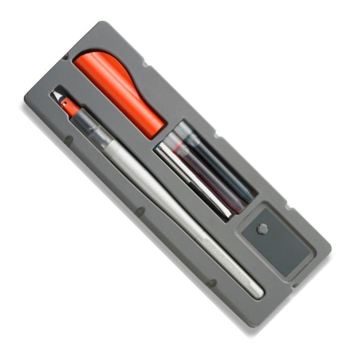 Cada estuche incluye una pluma Pilot Parallel de 1.5mm, dos cartuchos de tinta (negro y rojo), un kit para limpieza, e instrucciones de uso. Otros colores de tinta, convertidor de bomba y tintas líquidas compatibles están disponibles por separado.