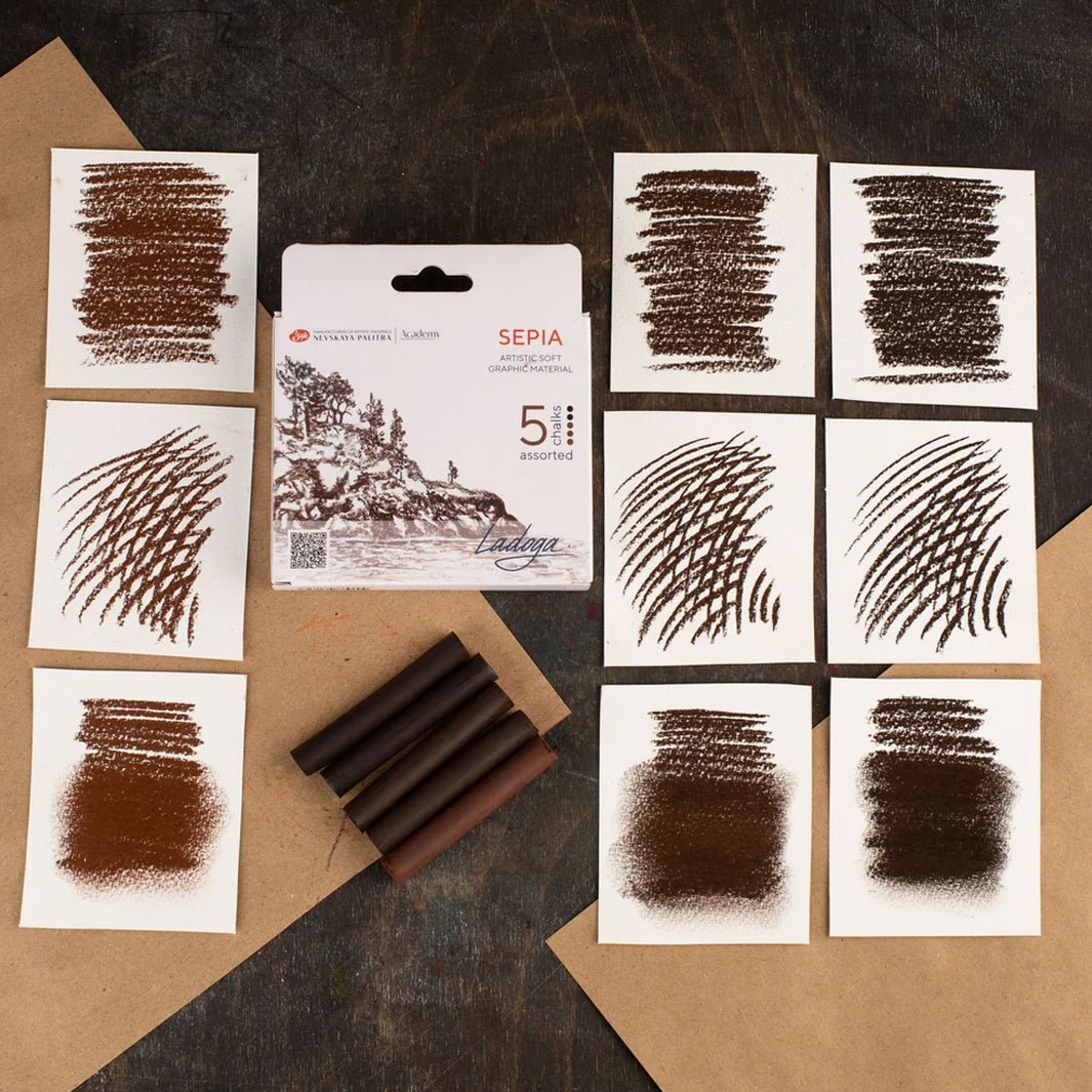 La sepia de Ladoga, también conocida como "salsa rusa", es un tipo de creta o pastel ultra versátil que podrás utilizar en seco o en húmedo, o mezclar ambas técnicas para conseguir una gran cantidad de efectos.