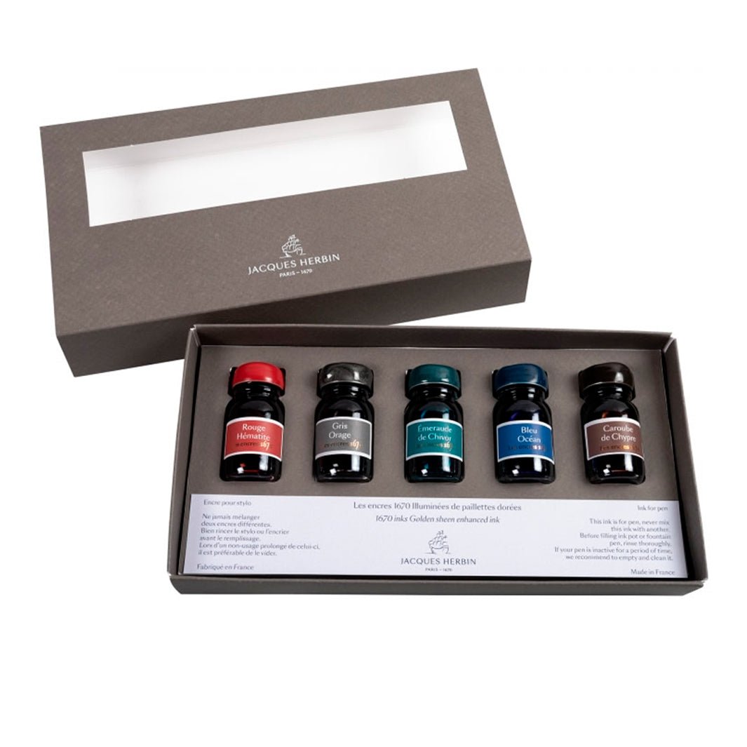 ¡Todas las tintas Herbin 1670 en un solo lugar! Este estuche trae los 5 colores de la Colección de Aniversario 1670: Rouge Hematite, Gris Orage, Emeraude de Chivor, Bleu Océan y Caroube de Chypre.