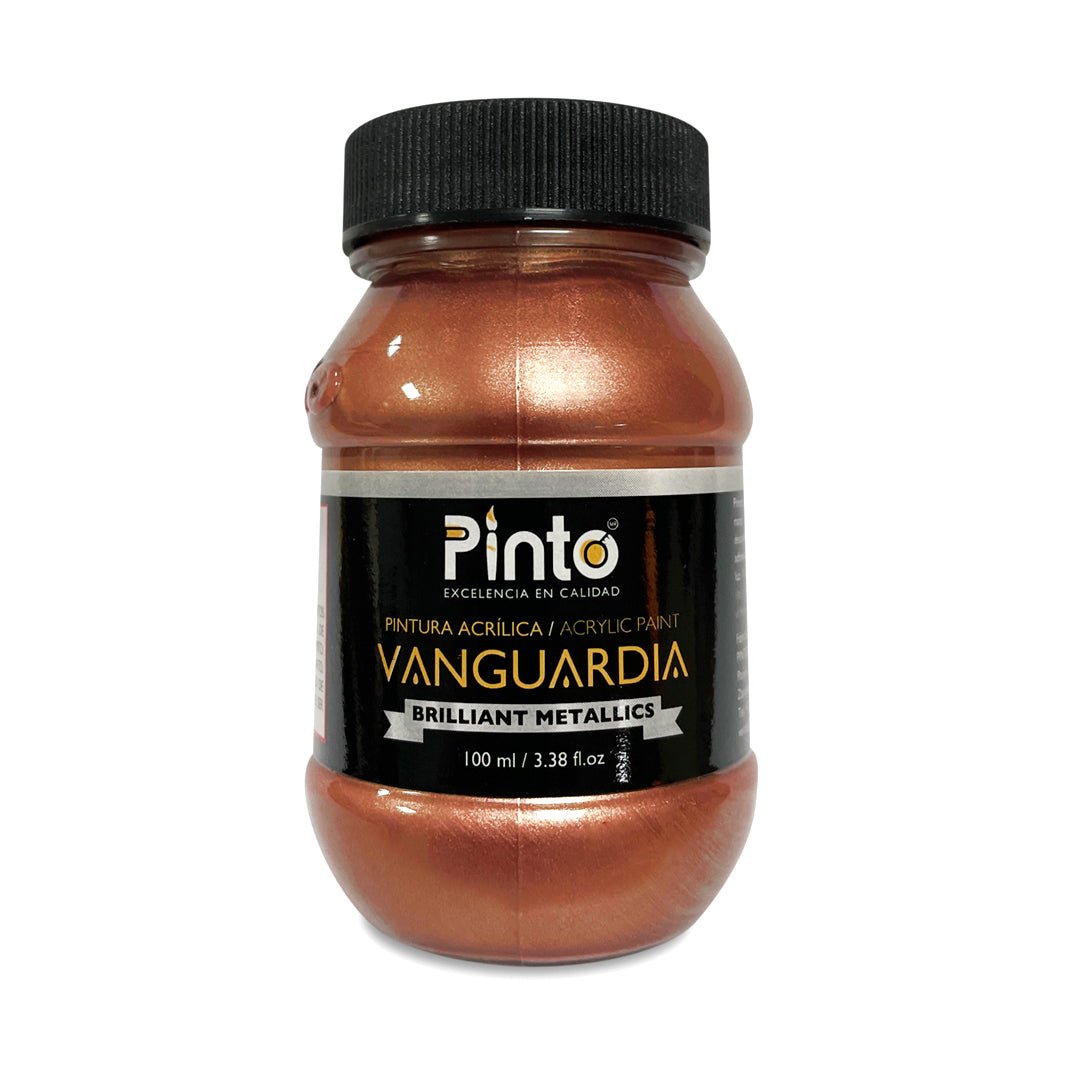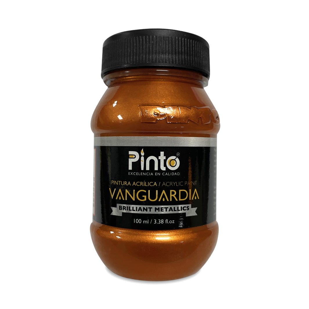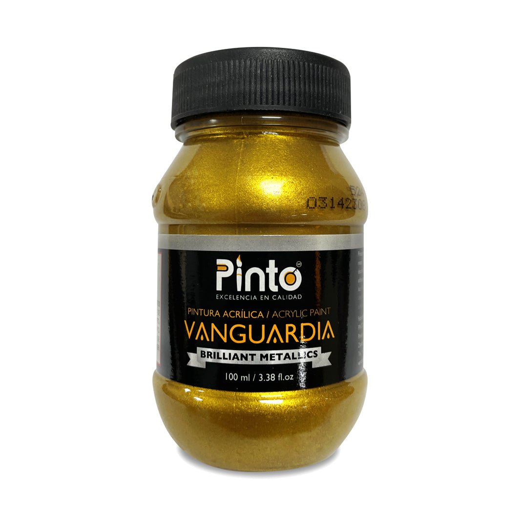 Los acrílicos metálicos Pinto Vanguardia está hechos a partir de pigmentos finamente molidos, resina acrílica, agua destilada y otros aditivos que dan como resultado una pintura acrílica mate con una viscosidad media y uniforme. Gracias a su concentración de pigmentos, los acrílicos Pinto son sumamente cubrientes; los colores son vibrantes y poseen un alto grado de resistencia a la luz.