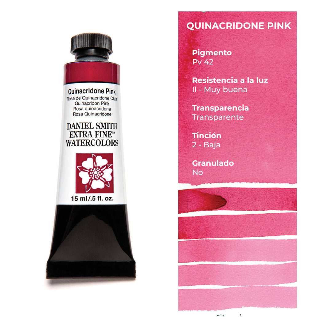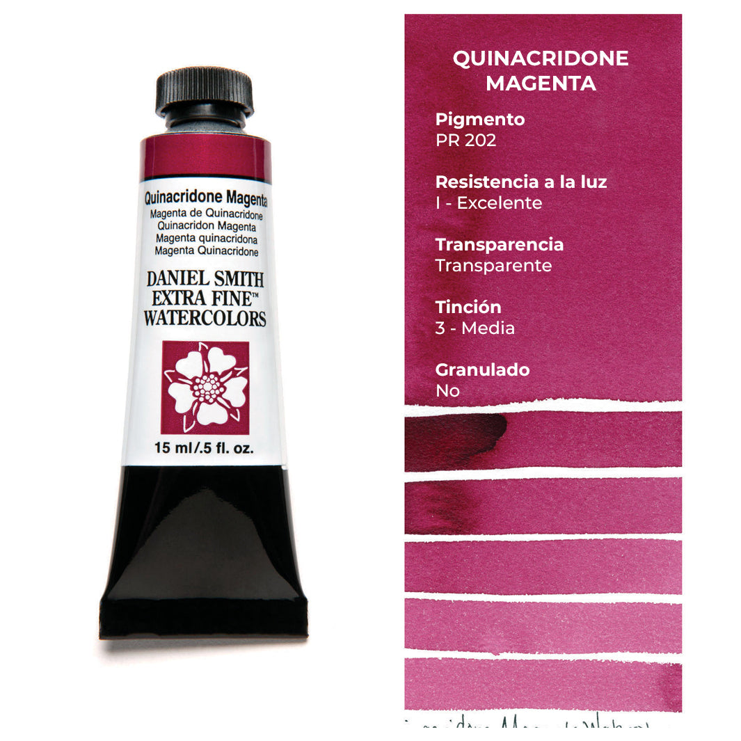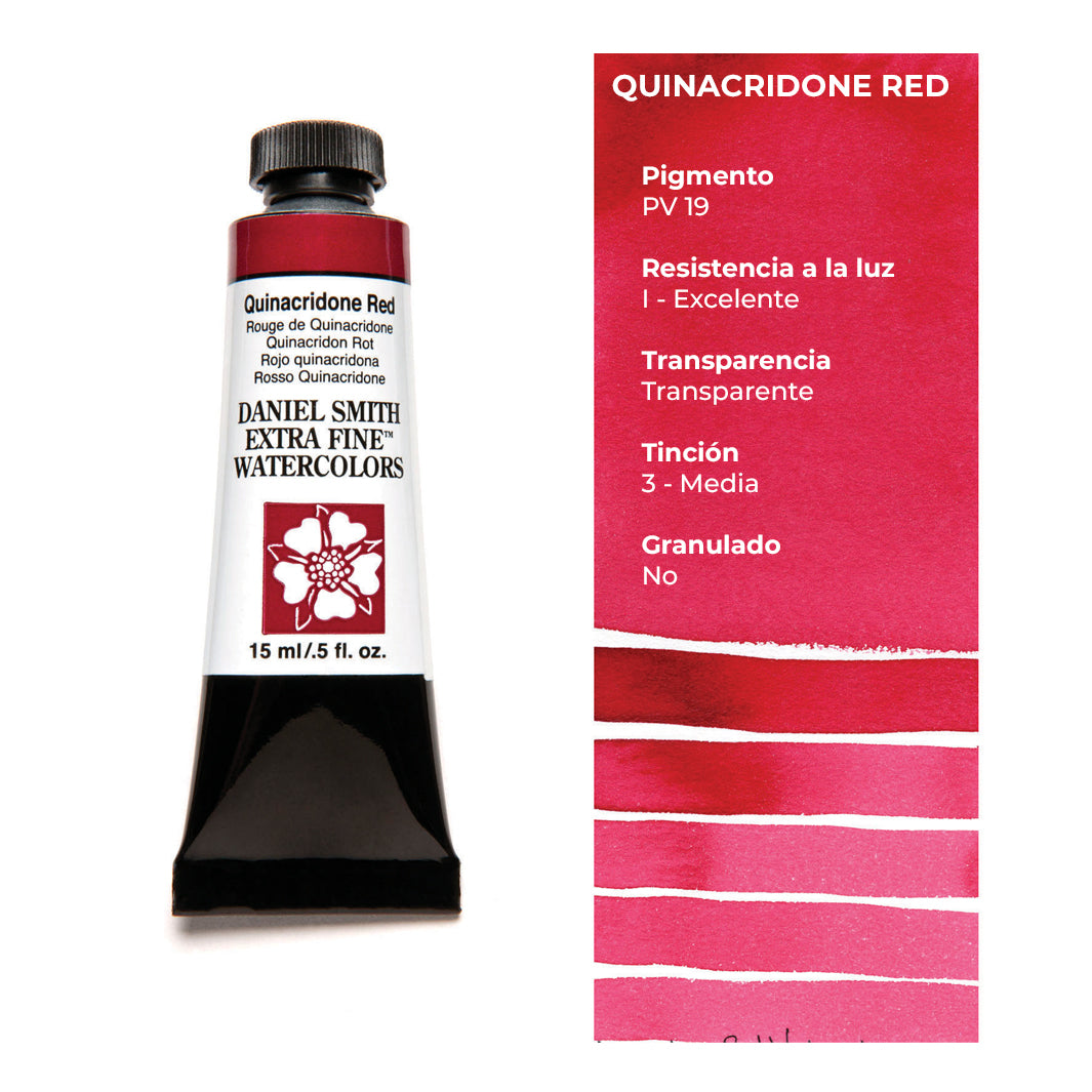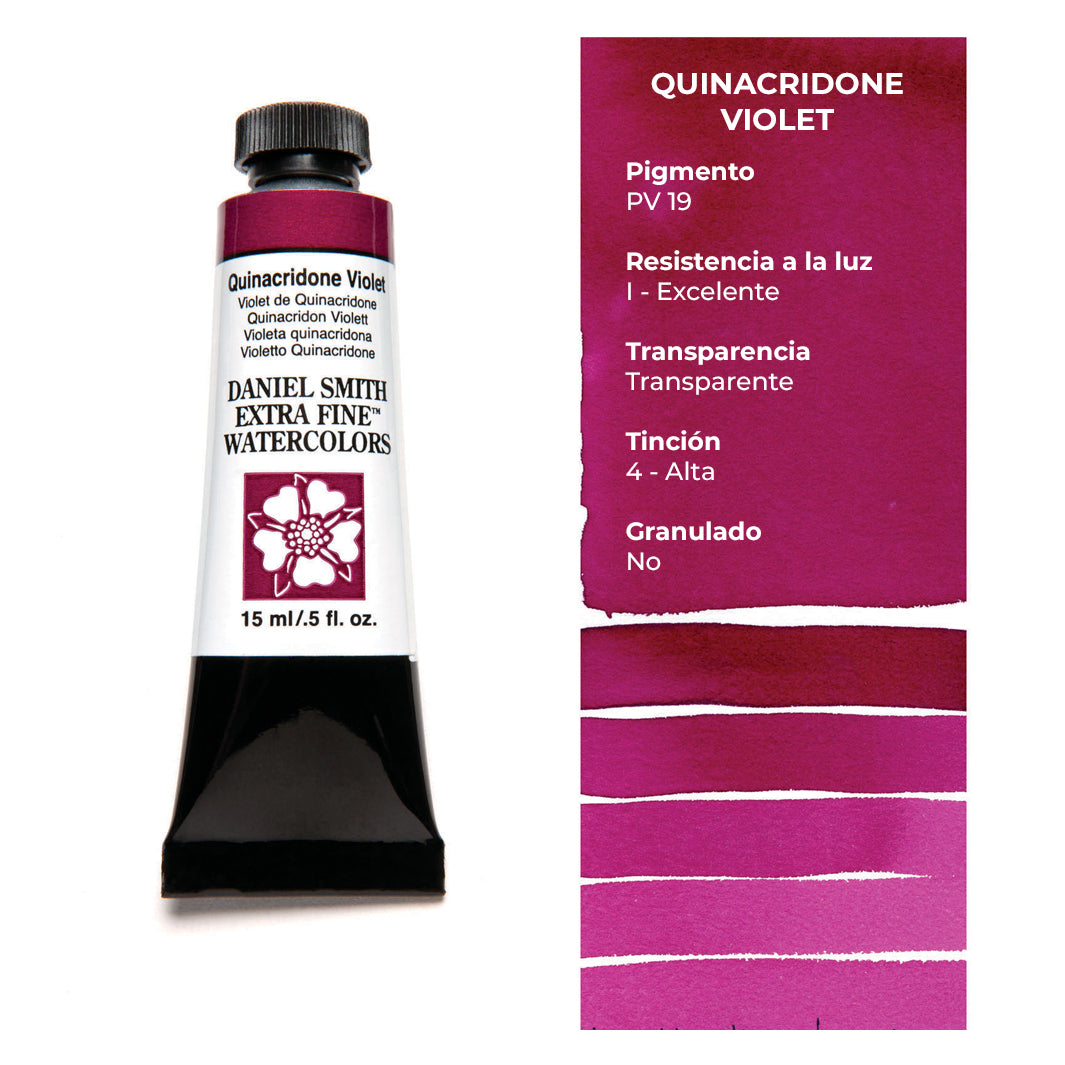 Cada tubo individual de acuarela Daniel Smith trae 15 ml de pintura; las tenemos disponibles en 100 colores, incluyendo los magníficos quinacridonas que solo Daniel Smith ofrece.