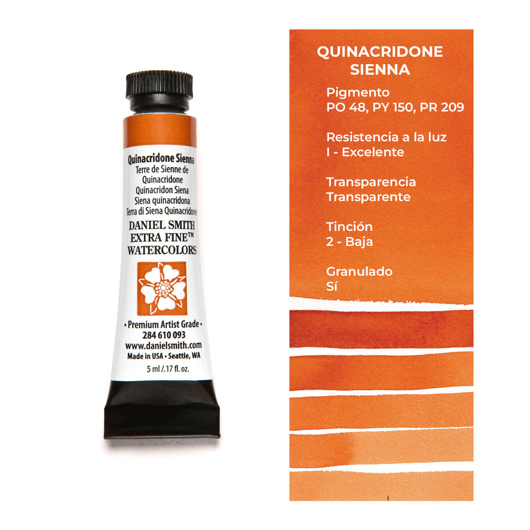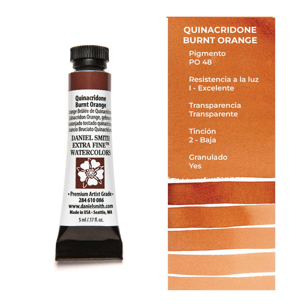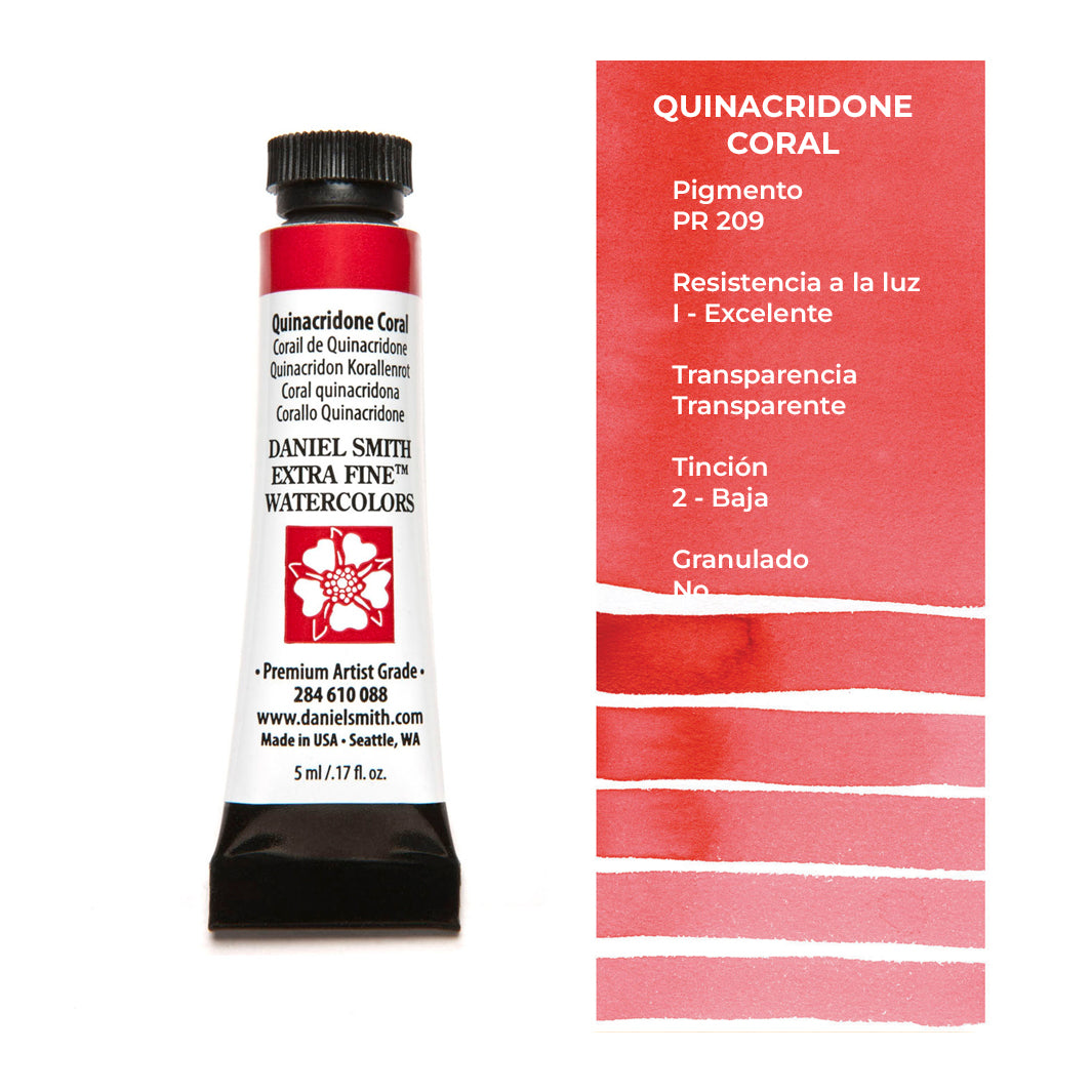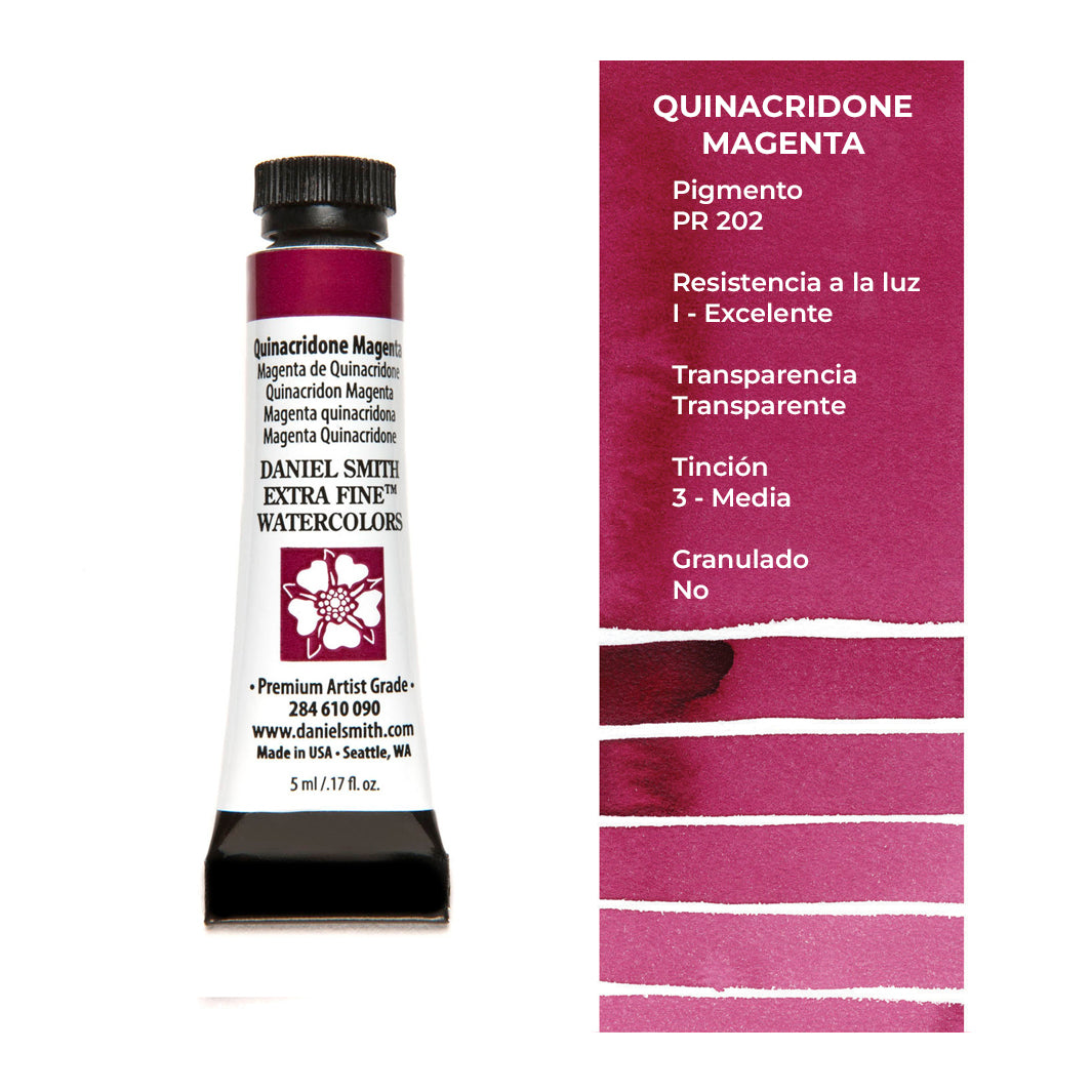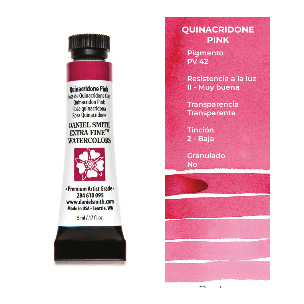 Cada tubo individual de acuarela Daniel Smith trae 5 ml de pintura; las tenemos disponibles en 100 colores, incluyendo una selección de cadmios y cobaltos verdaderos, los populares Opera Pink y Neutral Tint, y los magníficos quinacridonas que solo Daniel Smith ofrece.