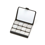 La paleta Demi es la más chiquita de todas; cuando está cerrada mide 5.5 x 4.5 x 0.7cm y pesa solo 26g (antes de ponerle pintura). Esta versión trae 12 mini pastillas con capacidad de 0.5ml cada una.